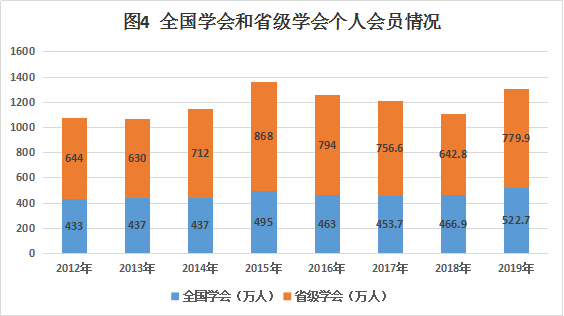 兩級學會個人會員[9]1302.6萬人,團體會員56.2萬個。其中全國學會個人會員522.7萬人,團體會員5.4萬個。省級學會個人會員779.9萬人,團體會員50.8萬個。