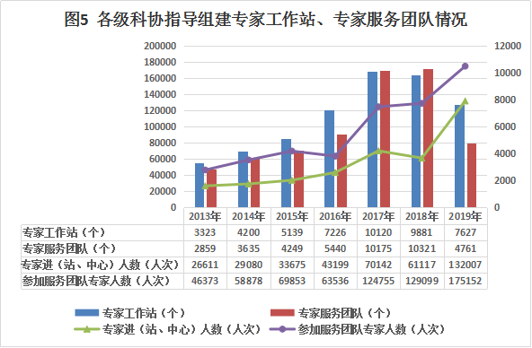 各級科協指導組建專家工作站[15]7627個,全年組織進站專家13.2萬人次。組建專家服務團隊[16]4761個,參加服務團隊專家17.5萬人次。
