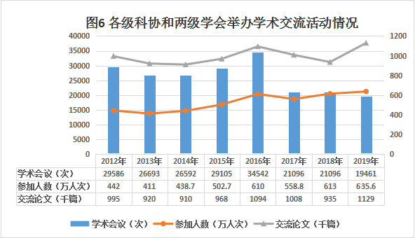 各級科協和兩級學會共舉辦學術會議19461場次,參加人數635.6萬人次,交流論文112.9萬篇。