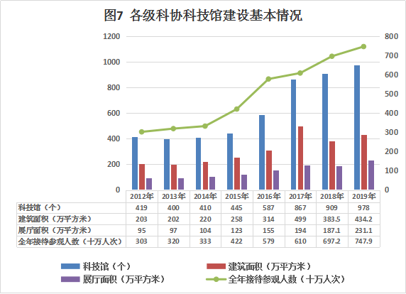 截至2019年底,各級科協擁有所有權或使用權的科技館[23]978個。總建筑面積434.2萬平方米,展廳面積231.1萬平方米。已實行免費開放的科技館870個。科技館全年接待參觀人數7479.4萬人次。流動科技館1773個。科普活動站(中心、室)5.6萬個,全年參加活動(培訓)人數4078.3萬人次。科普畫廊建筑面積(宣傳欄、宣傳櫥窗)176.7萬平方米,全年展示面積[24]433.7萬平方米。科普大篷車1057輛,全年下鄉次數3.5萬次。科普大篷車全年下鄉行駛里程737.8萬公里,受益人數1834.3萬人次。