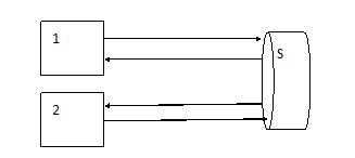 建立一個中心光交換節(jié)點S,有設(shè)備1、2,每個設(shè)備都有輸入和輸出兩條通訊鏈路與S連接,此時結(jié)構(gòu)圖如下。