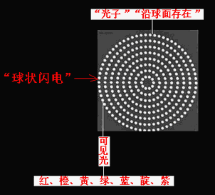 “棒電極”在球心對“球冠電極”“超短時間內的高能”(超高壓)充電、放電,可以產生“球狀閃電”,其機理為:“雙向激擊”、“球冠振蕩”。若地面為“球冠電極”,則表現為“滾地雷”“火球”,若空中云為“球冠電極”,則表現為空中“光球”。因為“球冠振蕩”的頻率的不同,“球狀閃電”內部呈現“嵌套球狀”,由外向里頻率由小到大,在可見光波段由外向里顯現為紅、橙、黃、綠、藍、靛、紫,而由外向里看,因疊加合成呈現白色,但是,當最外面的頻率較小時,也可能是黃色或綠色或藍色的;一個大“光球”,可以分離為兩個或幾個小“光球”,但其顏色將會“變深”(如圖6、7)。 [6]