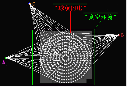 如圖12,A、B、C等處的光源發出的光線,在通過“球狀閃電”時,都在“球狀閃電”中的“光子流體能量負壓”的作用下,被“吸入”“留住”作“圓周運動”,而不能穿過“球狀閃電”,光源對面的觀察者將不能看到這個光源發出的光線——呈現“黑洞效應”。