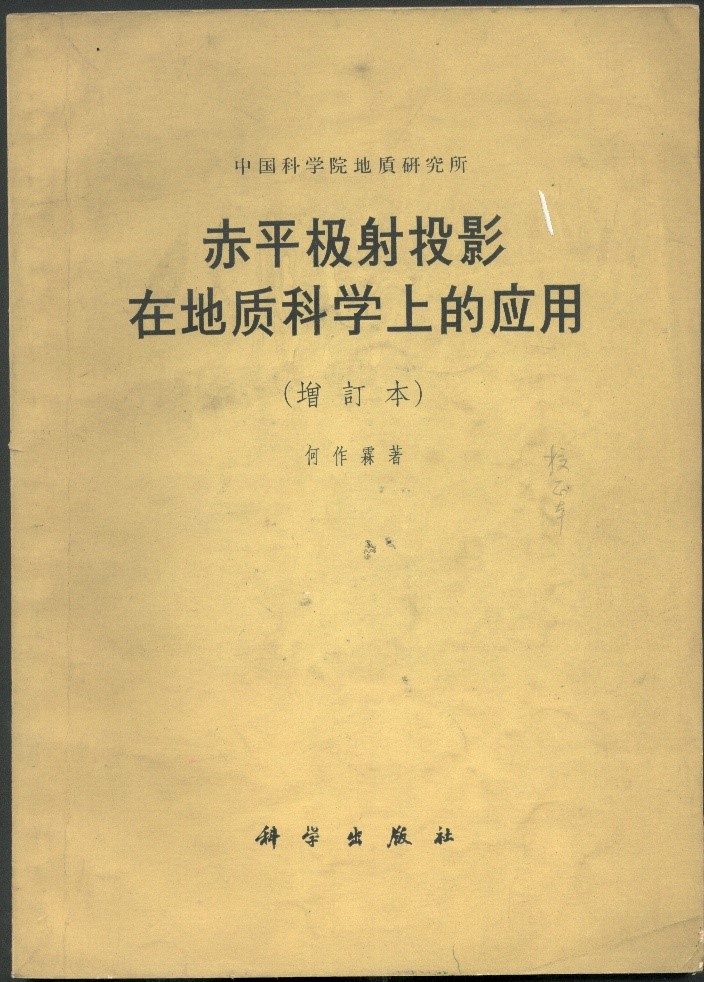 “極射赤平投影”不僅是研究巖組學(xué)的重要工具,而且也是地質(zhì)構(gòu)造研究方面的方法典范,在地質(zhì)學(xué)上廣泛應(yīng)用。何作霖是我國第一個對該方法在地質(zhì)科學(xué)上應(yīng)用做綜合闡述者。他集多年的理論研究、科研實踐及各國零散資料撰寫出版了《赤平極射投影在地質(zhì)科學(xué)中的應(yīng)用》(科學(xué)出版社,1958)一書,深受巖礦工作者喜歡,后又多次再版。這是世界上第一部這方面的專著,也是中國構(gòu)造地質(zhì)學(xué)和巖石礦物學(xué)工作者長期必讀的重要工具書。