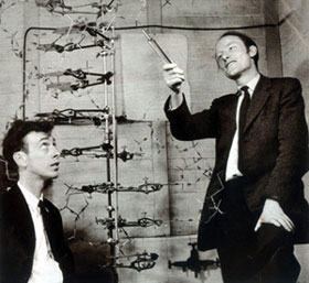 1951年~1953年在英國期間,沃森和克里克合作,應用物理學、化學的新技術和生物學研究的新成果,用綜合的觀點,把自己的創造性工作同前人的研究成就結合起來,提出了DNA的雙螺旋結構學說,這個學說不但闡明了DNA的基本結構,并且為一個DNA分子如何復制成兩個結構相同DNA分子以及DNA怎樣傳遞生物體的遺傳信息提供了合理的說明,成功地解決了DNA的三維結構問題。