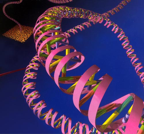1953年4月25日,世界權威雜志《自然》雜志發表了沃森、克里克的一篇900多字優美精煉的短文,宣告了DNA分子雙螺旋結構模型的誕生。這個結構模型的要義是:DNA是一個長長的雙鏈分子,由兩條同軸反向相互纏繞的多核苷酸鏈組成,外側是由脫氧核糖和磷酸根組成的分子骨架,中間是由互補的堿基對組成的階梯,堿基配對方式是A配T,C配G;堿基對間距為0.34納米,每10個堿基對形成一個螺旋周期,螺旋直徑為1納米。這個模型既能從螺旋性、分子直徑、堿基對的幾何學尺度等方面闡明X射線衍射圖像,又能以堿基專一性互補配對來解釋查伽夫當量定律。DNA雙螺旋結構是一個極為成功、無懈可擊的DNA分子結構模型,它由兩條右旋但反向的鏈在同一個軸上盤而成,像一個螺旋形的梯子,生命的遺傳密碼就列在梯子橫檔上。據科學家統計,一個體細胞的全部DNA“螺旋樓梯”長約2米。若將一個人的全部DNA連接起來,可以在地球和太陽之間扯上80個來回。 DNA分子雙螺旋結構模型的發現,是生物學史上的一座里程碑; 1962年,沃森、克里克因發現DNA分子結構,與改進了X射線衍射技術的威爾金斯一起獲得了諾貝爾醫學或生理學獎。
