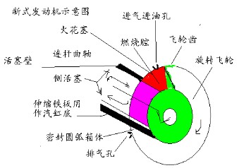 如圖所示:做功之初,提起活塞,首先將伸縮鐵板插進密封圓弧箱體內用作汽缸底,飛輪齒用作汽缸頂,進油進氣后,推進活塞,壓迫油氣做功,飛輪旋轉帶動車體運動。最后排出廢氣復位,重復做功。