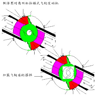 從單缸改進為雙缸后,再加裝一個飛輪,就像自行車一樣,汽缸做功速度(踩踏速度)不影響車體速度。上面的汽缸做功時,下面的汽缸充氣,下面的做功時,上面的充氣。交替做功。在一個沖程內完成二次做功。