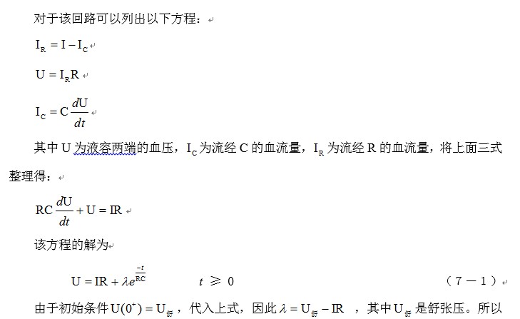 下圖是心臟收縮期回路簡單模擬,血管的狀態用R和C簡單并聯表示。由于血管各處都存在液容,實際的情況可能很復雜,但用簡單參數分析,也同樣能反映血液循環的一些特性。為了分析的方便,將心臟射血輸出量近似為恒流源。