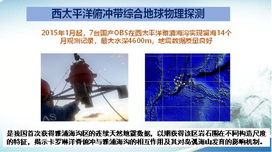 在2015年,我國在西太平洋雅浦海溝投放了7臺海底地震儀,留海觀測時間是14個月,最大的水深是4600米。記錄的地震波形都很好。主要用于揭示巖石圈在不同構造尺度的特征,了解卡羅琳洋脊俯沖與雅浦海溝的相互作用及對島弧海山發育的影響機制。