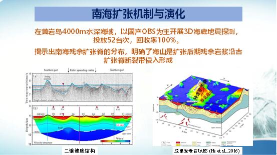 我國在南海地區實施了用纜繩傳輸在海底布設觀測網所得的數據,每年在南海投放80-90臺海底地震儀進行三維觀測,用廣義射線追蹤方法得出了這一地區的地下結構。我國布設的水聲計也記錄到外國潛艇在我國南海活動的證據。