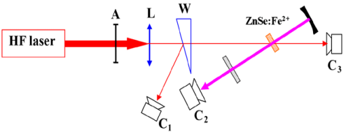 但是Fe2+:ZnSe激光器的實現也存在一個難點,即在室溫下難以實現激光輸出,這是由其自身的能級特點所決定的。目前電子所采用自行研制的脈沖HF激光器泵浦Fe2+:ZnSe晶體,取得了比較好的效果,在室溫下實現了脈沖能量高達80 mJ的激光輸出。實驗光路如圖2-11所示。實驗未采用垂直入射泵浦方式,而采用小角度斜入射的泵浦方案,解決了雙色鏡鍍膜難的問題。
