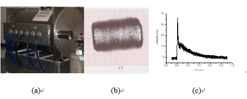 我們研制的高重復頻率TEA CO2激光器,如圖3-3(a)所示,輸出波長10.6 μm,單脈沖能量可達15 J,重復頻率可達150 Hz,平均功率達到2250 W。圖3-3中(b)、(c)分別為該激光器的光斑形狀及脈沖波形。該激光器光斑形狀方正,能量分布均勻,并具有較高的峰值功率。