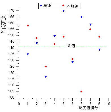 最后采用顯微硬度計,測量樣品除漆前后的維氏硬度(HV)。測量結果如圖3-7所示,可以發現,在高于均值的樣品中,除漆的有5個,未除漆的有6個,并且分布表現出無規律性,所以飛機蒙皮經過激光除漆后維氏硬度并沒有明顯差別。
