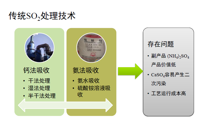 傳統的二氧化硫處理技術主要有鈣法吸收、氨法吸收,二者均存在運行成本高,易產生二次污染的問題。