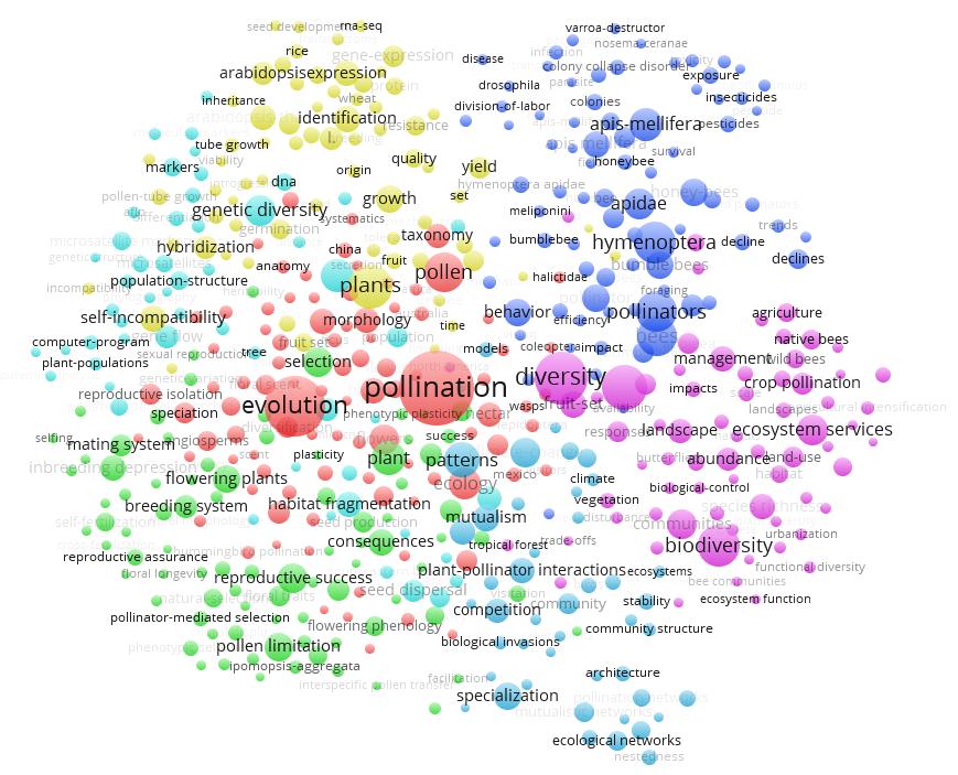 與此同時我們還通過ESI對pollination和pollinator等關(guān)鍵詞進行檢索,可以大致得出傳粉昆蟲研究領(lǐng)域的現(xiàn)有研究前沿如下:1)常用新煙堿類殺蟲劑對蜜蜂的殺傷作用;2)野生授粉昆蟲對農(nóng)業(yè)增收和作物健康的積極影響;3)傳粉昆蟲種群測量與評估;4)花朵與傳粉昆蟲的生態(tài)聯(lián)系。通過利用Vos Viewer軟件繪制傳粉生物學(xué)關(guān)鍵詞共現(xiàn)(co-occurrence)聚類圖,獲得傳粉生物學(xué)領(lǐng)域的研究熱點包括:1)傳粉昆蟲的形態(tài)學(xué)、系統(tǒng)進化、分類學(xué)方面的研究;2)傳粉昆蟲介導(dǎo)的植物繁殖、選育、選種等的研究,以及花粉限制對傳粉昆蟲的影響;3)殺蟲劑導(dǎo)致傳粉昆蟲,尤其是蜜蜂、熊蜂的種群下降的影響;4)傳粉昆蟲介導(dǎo)的植物基因表達、生長、增產(chǎn)等;5)景觀變化、城市化等環(huán)境因素導(dǎo)致生物多樣性降低、傳粉服務(wù)功能下降、傳粉昆蟲群體數(shù)量下降等影響評估,并提出相關(guān)的控制與管理措施;6)植物-傳粉昆蟲互作與共生、植物與傳粉昆蟲形成的生態(tài)網(wǎng)絡(luò)結(jié)構(gòu)等方面的研究;7)傳粉使植物基因流擴散,使植物基因變異和多樣性。