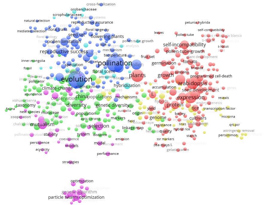 利用Vos Viewer軟件分析2013-2017年中國傳粉生物學(xué)領(lǐng)域的SCI論文,獲得中國傳粉生物學(xué)領(lǐng)域的研究熱點是:1)植物花粉管生長、發(fā)育等分子、細胞層面基礎(chǔ)機制研究;2)傳粉昆蟲的分類學(xué)研究,及其遺傳多樣性、保護、種群擴散等方面的研究;3)昆蟲傳粉在植物遺傳育種、進化中發(fā)揮重要作用;4)與傳粉相關(guān)的植物轉(zhuǎn)錄因子、microRNA、殺蟲劑耐藥性等方面的研究;5)傳粉昆蟲的種群優(yōu)化、傳粉昆蟲互作等方面的研究。