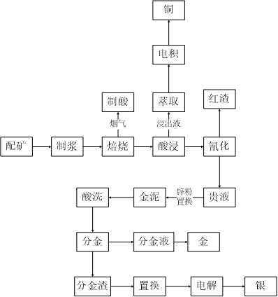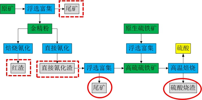 黃金生產過程的固廢包括浮選尾礦、氰化渣(紅渣和直接氰化渣)(圖3)。可對金精礦的浮選尾礦進行氰化提金或制造建材,對直接氰化渣進行浮選回收有價元素。
